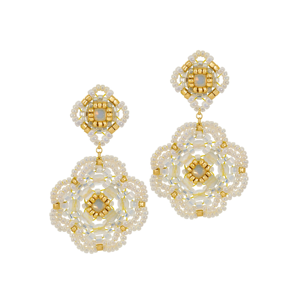 These MIGUEL ASES Golden Opalescent White Earrings feature luminous opalescent white stones set in golden frames. These earrings offer a clean, timeless look that pairs well with any style. The soft shimmer of the opalescent stones creates subtle movement and light, making them suitable for both everyday wear and special occasions.